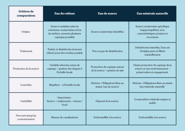 - On distingue eau du robinet vs eau minérale naturelle : deux eaux potables, mais origines, traitements, modes de protection et cadres de contrôle diffèrent.
