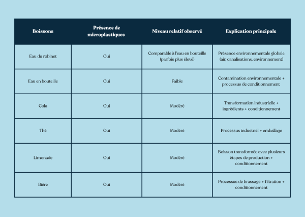 Autre point intéressant : l’eau en bouteille n’est pas la boisson la plus concernée. Une étude de l’ANSES (Agence nationale de sécurité sanitaire, en France) montre que certaines boissons comme les sodas, la bière ou les limonades contiennent davantage de microplastiques que l’eau en bouteille.