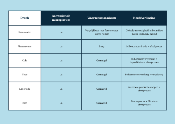 Bovendien zijn andere dranken vaak een grotere bron van microplastics: frisdrank, bier en limonade bevatten vaak meer microplastics dan flessenwater.